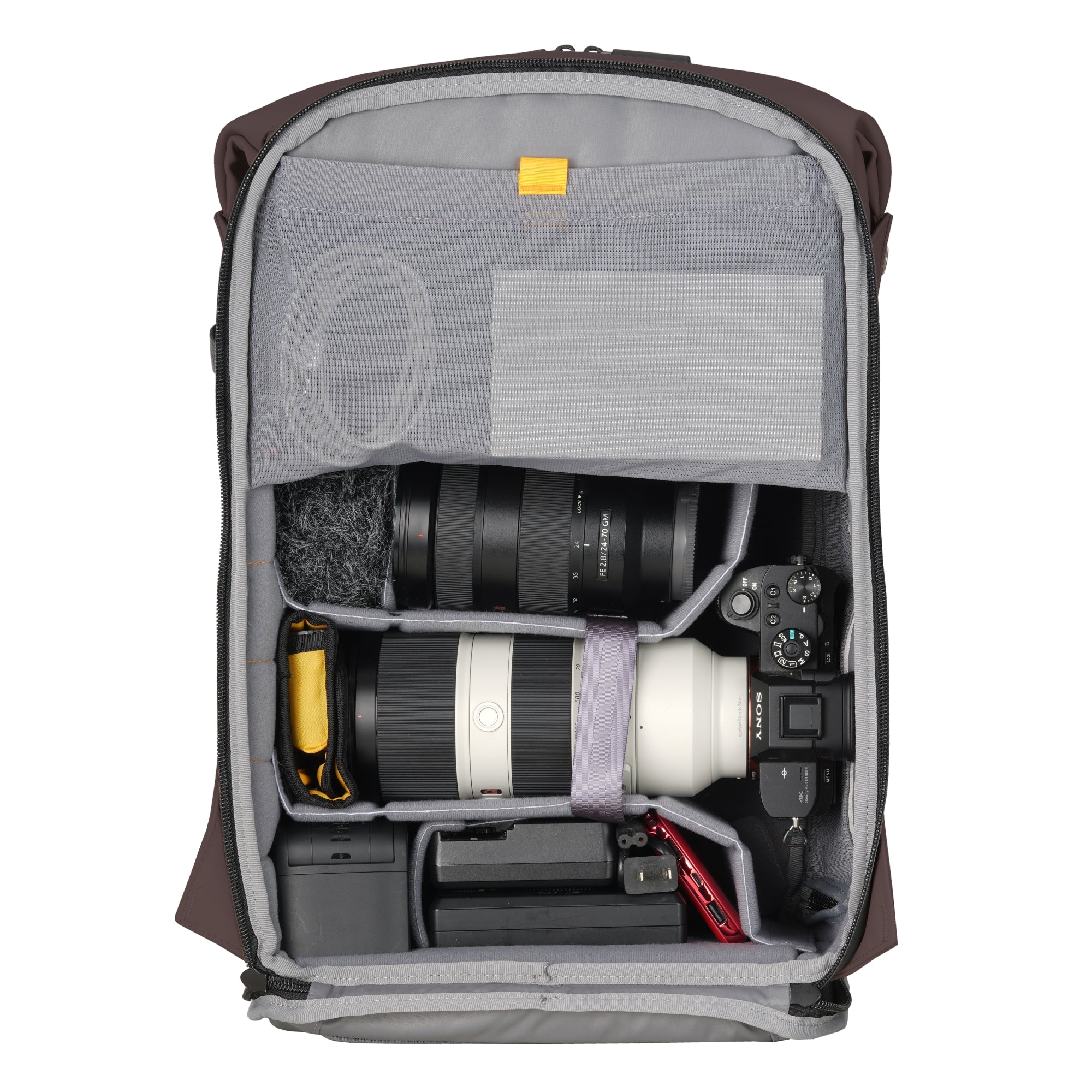 From the outside, the VEO Lite B25L looks like a premium everyday backpack—perfect for commuting, travel, or city exploration. Inside, it reveals a thoughtfully structured layout that fits a full-frame camera with a 70–200mm f/2.8 lens attached, plus 3–4 additional lenses or accessories. The dual-compartment design separates your gear and personal items, with a dedicated lower camera section and an upper daypack compartment for everyday essentials or additional equipment.