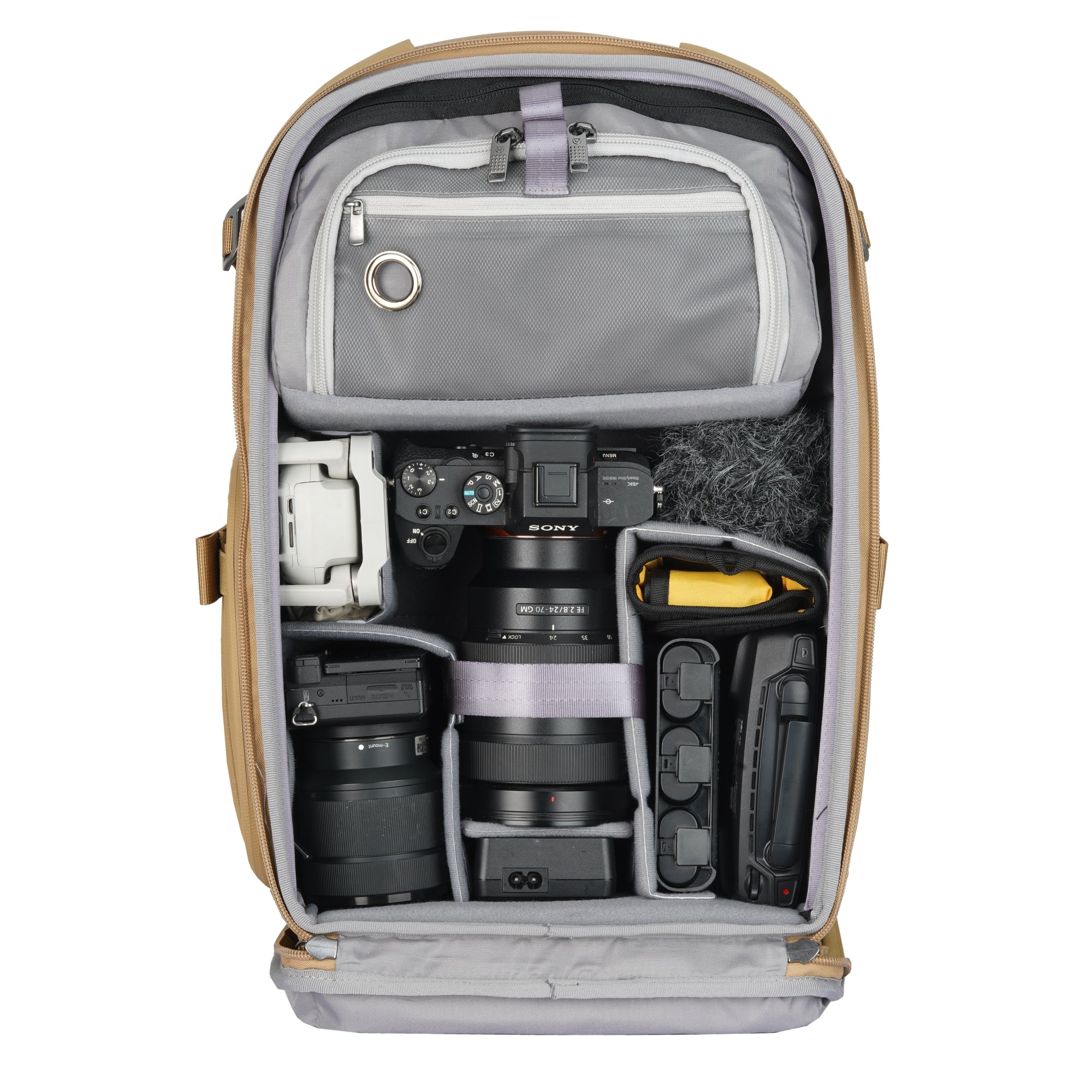 The upper daypack compartment allows you to carry everyday items or additional camera gear -- including a space for a power bank with slots to insert a cable connected to the device in your hand for power on the go. You can access the compartment through the top of the bag, but it is also designed for fast access from the rear. Additionally, you can remove this daypack compartment and set up the backpack for top access to your camera.